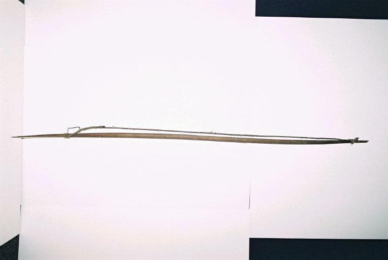 Arc dont le corps en bois est à section transversale semi-circulaire. La corde en fibres torsadées est fixée sur le corps par un système de noeuds. une des extrémités est lacunaire; l'autre est fendue