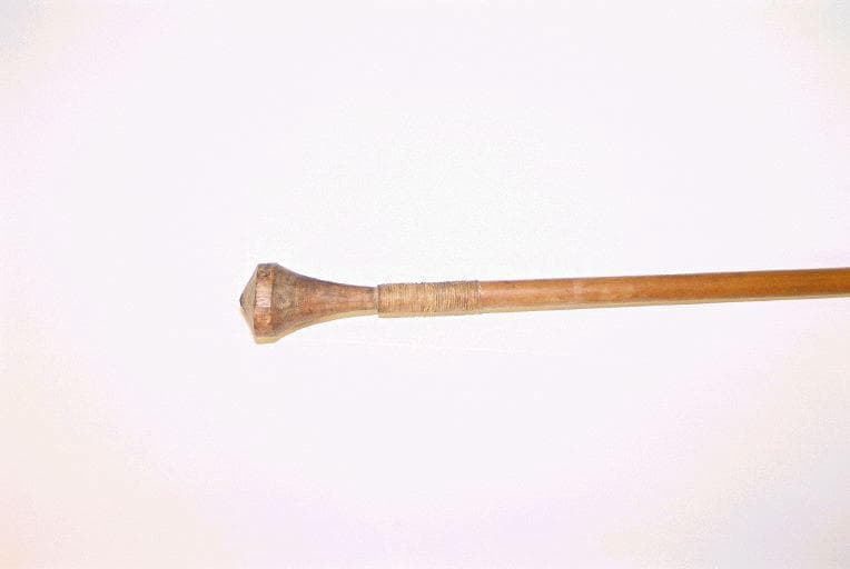 Sagaie dont le manche en bambou est à section transversale circulaire.La partie distale est manquante. L'autre extrémité du manche est composée d'un aileron conique en bois enchâssé dans le manche et fixée par des ligatures en fibres