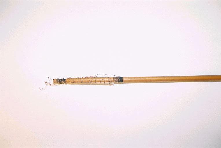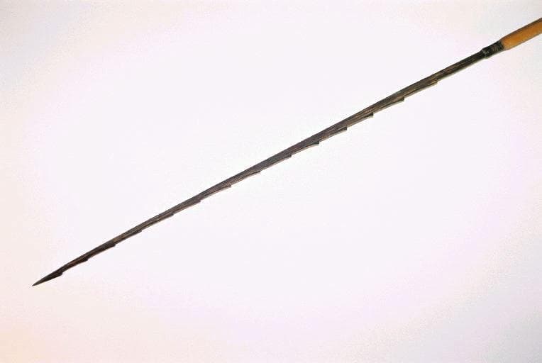 Sagaie dont le manche est en bambou. La partie distale est formée d'une longue lame en bois comportant des barbelures sur un côté et fixée au manche par des ligatures en fibres. L'autre extrémité du manche par des ligatures en fibres. L'autre extrémité du manche comporte 2 ailerons en plumes (très lacunaires), fixées au manche par des ligatures en fibres. Sagaie utilisée comme flèche