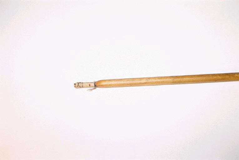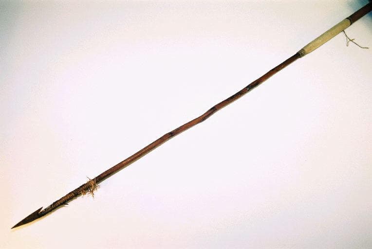 Sagaie dont le manche est en bambou. La partie distale est formée d'une tige en bois fixée au manche par des ligatures en fibres. L'extrémité de la tige est composée d'une pointe en fer d'une ailette et d'un ergot en fer dirigé vers le manche. La pointe et l'ergot sont fixés à la tige en bois par des ligatures en fibres recouvertes d'une pâte végétale (?) noircie. Sagaie utilisée comme flèche