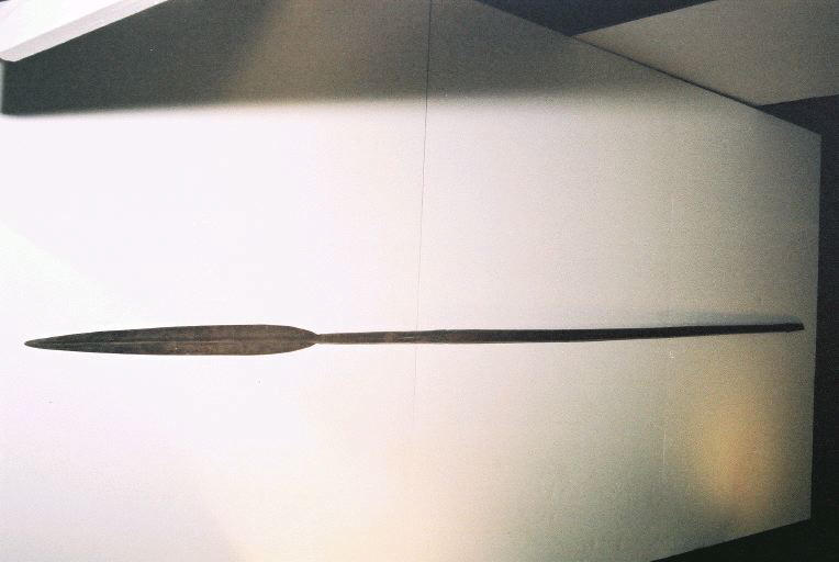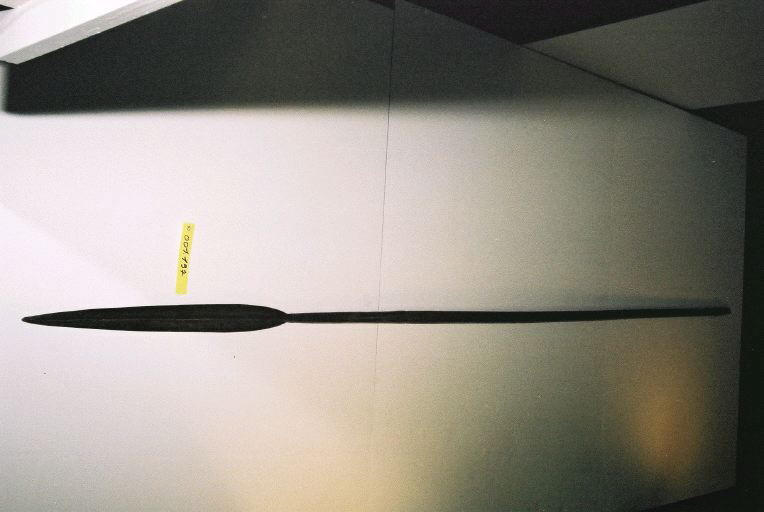 Lance dont le manche en bois est à section transversale circulaire. La partie distale est composée d'une lame en fer longue et pointue avec une nervure centrale en relief. Décor de 2 petits médaillons en cuivre. L'autre extrémité du manche est équipée d'un embout aplati