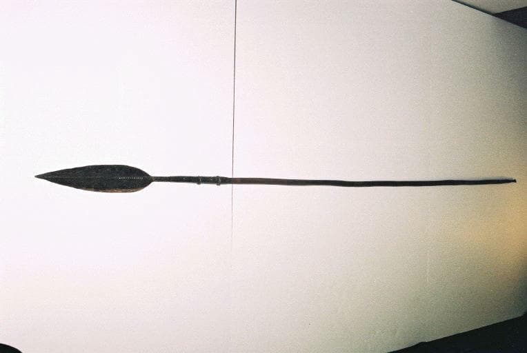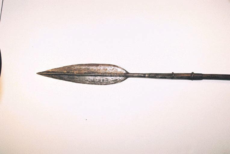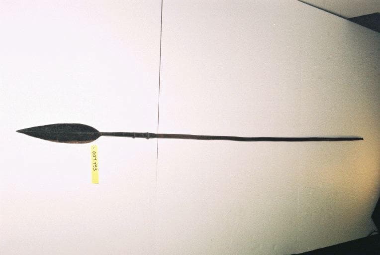 Lance dont le manche en fer est à section transversale circulaire. .La partie distale est composée d'une lame en fer avec une nervure centrale et équipée de 2 bagues en cuivre. L'autre extrémité du manche est équipée d'un embout aplati en fer en forme de spatule