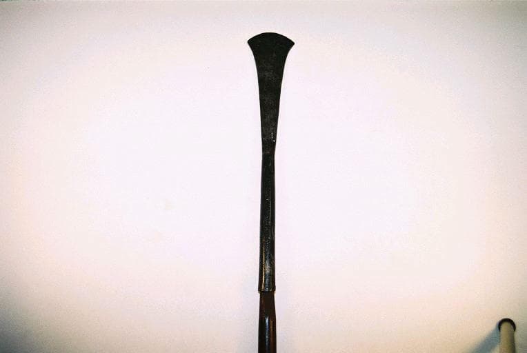 Sagaie dont le manche en bois est à section transversale circulaire. La lame est manquante. L'autre extrémité du manche est équipée d'un embout aplati en fer en forme de spatule