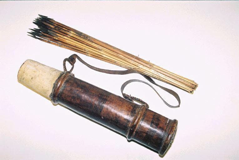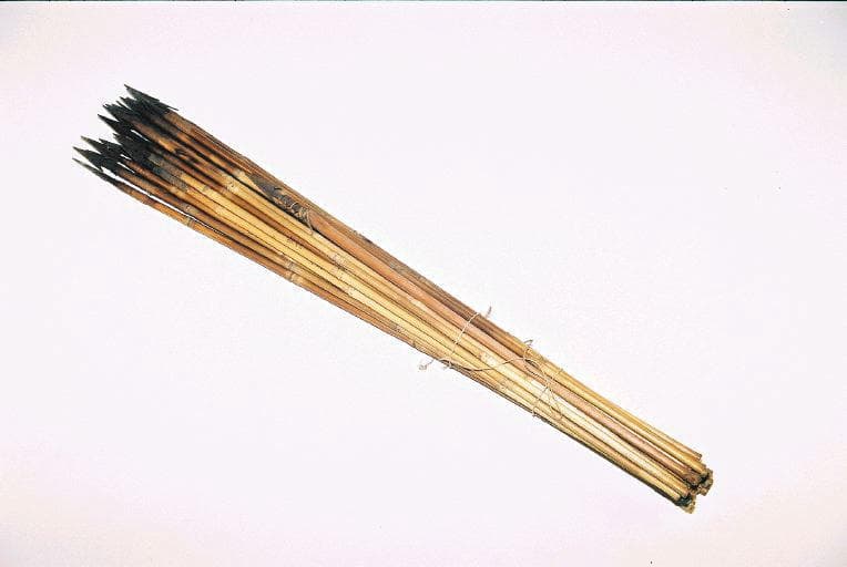 Lot de 25 flèches contenues dans le carquois 001.245.1. Flèches dont le manche est en bambou et la pointe en fer à barbelures fixée au manche par des ligatureses en fibres
