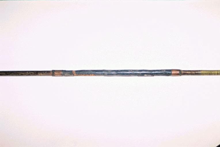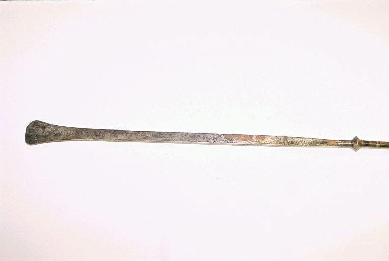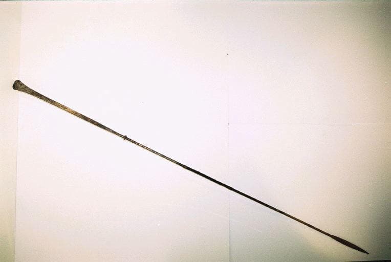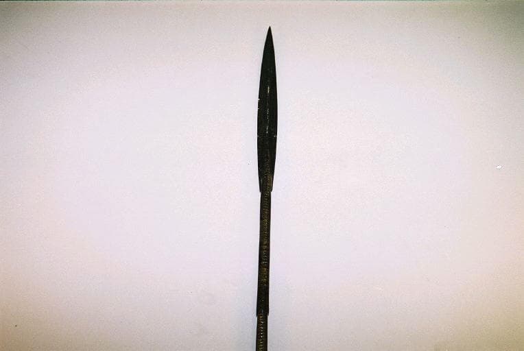 Sagaie en fer dont le manche est à section transversale circulaire. Nombreuses gravures de lignes parallèles dans le sens transversal et incrustations de cuivre. Fer lancéolé et base en forme de spatule. La partie centrale du manche est recouverte d'une bande de cuir maintenue par deux anneaux de cuivre