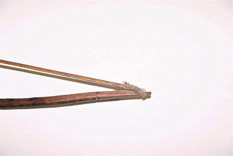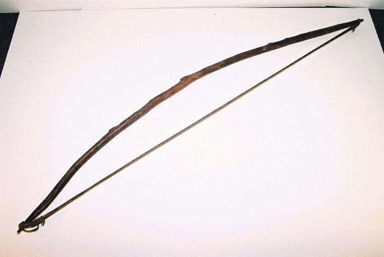 Arc dont le corps en bois est à section transversale circulaire. La corde en bambou est fixée au corps par des ligatures en fibres et un système de noeuds
