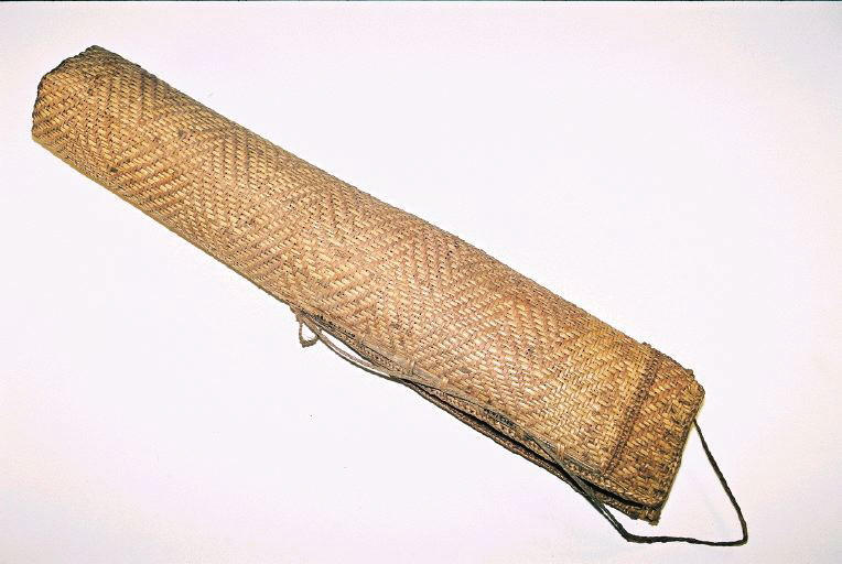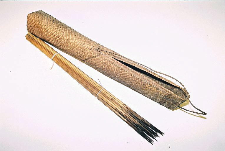 Carquois en vannerie de section canée à une extrémité et rectangulaire étroite à l'autre. Il est ouvert à moitié dans la longueur. Equipé d'une anse en cordelettes de fibres tressées. Contient le lot de flèches 001.270.2