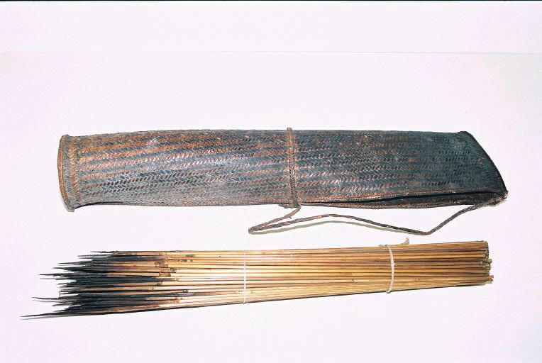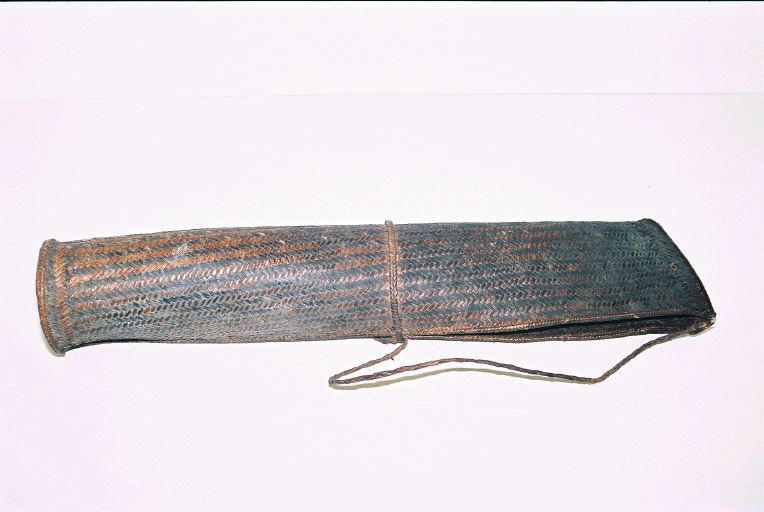 Carquois en vannerie de section canée à une extrémité et rectangulaire étroite à l'autre. Il est ouvert à moitié dans la longueur. Equipé d'une anse en cordelettes de fibres tressées. Contient le lot de flèches 001.271.2