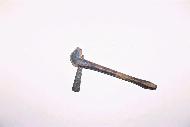 Modèle réduit d'une sorte de ciseau à bois dont le manche en bois bicolore est légèrement coudé et équipé d'une lame en fer droite enchâssée dans le manche au niveau de la face externe du coude
