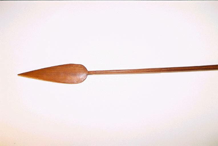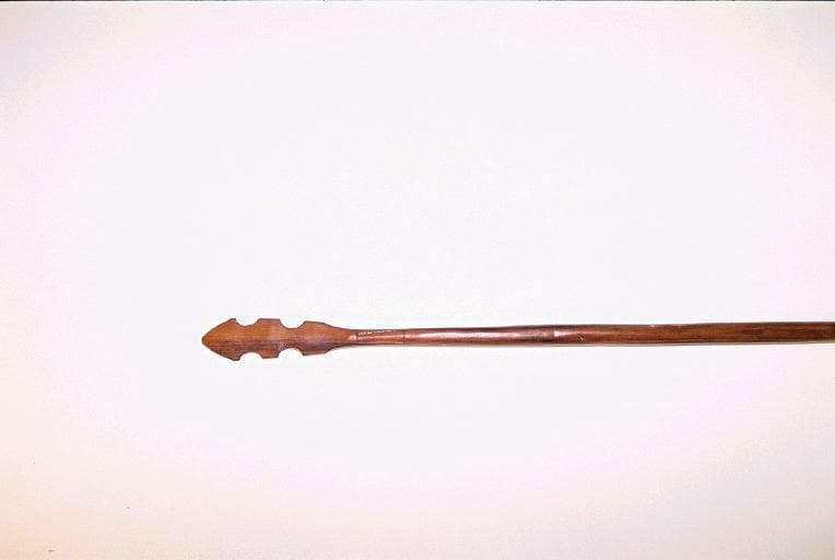 Sagaie dont le manche, la lame et l'aileron sont en bois. Il s'agit d'une imitation d'une sagaie avec lame et aileron en métal. Les encoches de fixation de la lame et de l'aileron ont été reproduites