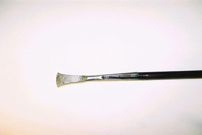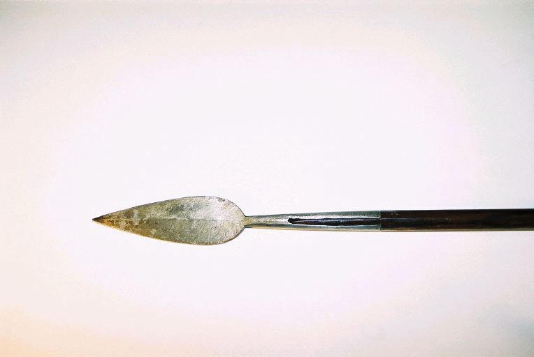 Sagaie dont le manche en bois (couleur acajou ? ) est à section transversale circulaire. la lame en fer en forme de feuille est enchâssée sur le manche. L'autre extrémité du manche comporte un aileron en forme de spatule en fer enchâssé sur le manche