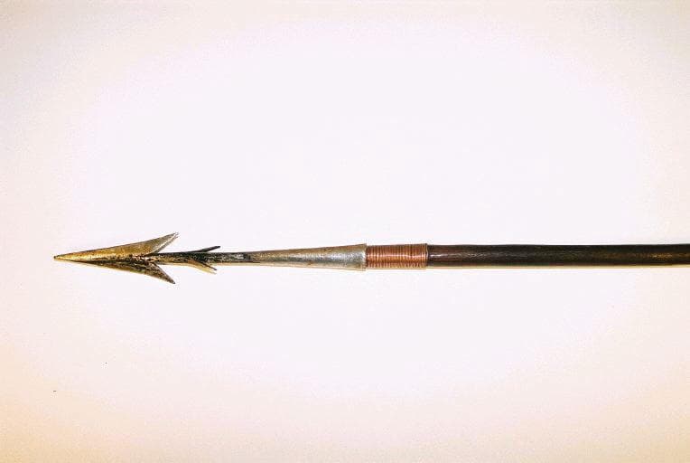 Sagaie dont le manche en bois comporte un enroulement de cuivre près de la lame et un enroulement de fer pour le lestage à l'autre extrémité. La lame est composée d'une tige et se termine en pointe à deux ailettes. Sur la tige, deux ergots courts sont dirigés vers le manche