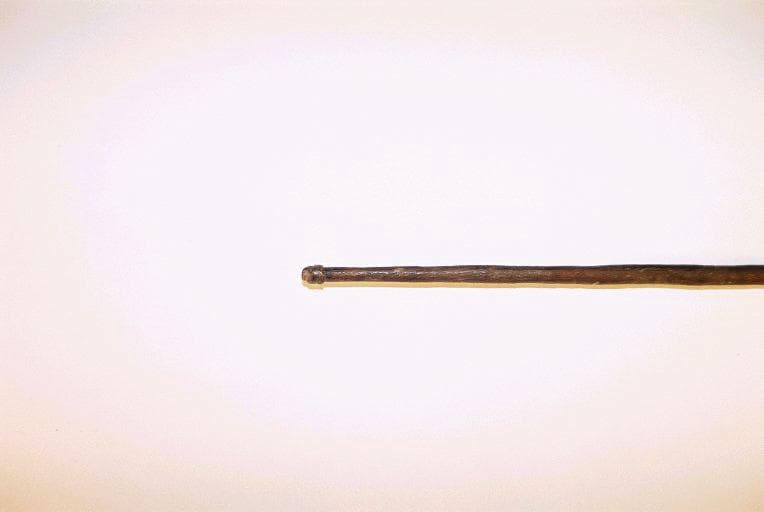 Sagaie dont le manche en bois comporte un enroulement de cuivre près de la lame et un enroulement de fer pour le lestage à l'autre extrémité. La lame est composée d'une tige et se termine en pointe à deux ailettes. Sur la tige, deux paires d'ergots courts sont dirigés vers le manche