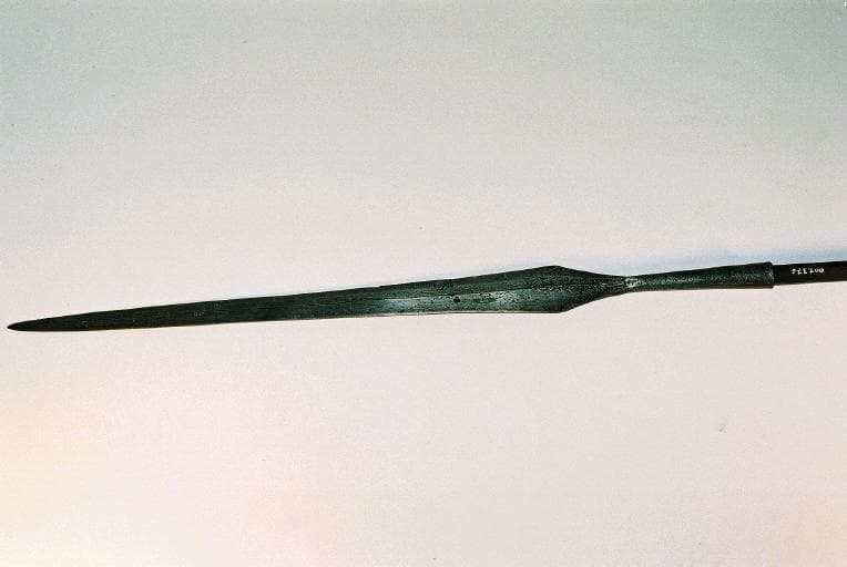 Sagaie dont le manche en bois est lacunaire à une extrémité. L'autre extrémité comporte une longue lame décorée sur toute sa longueur de motifs géométriques incisés