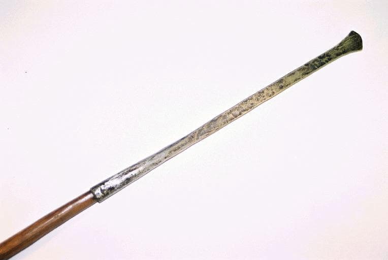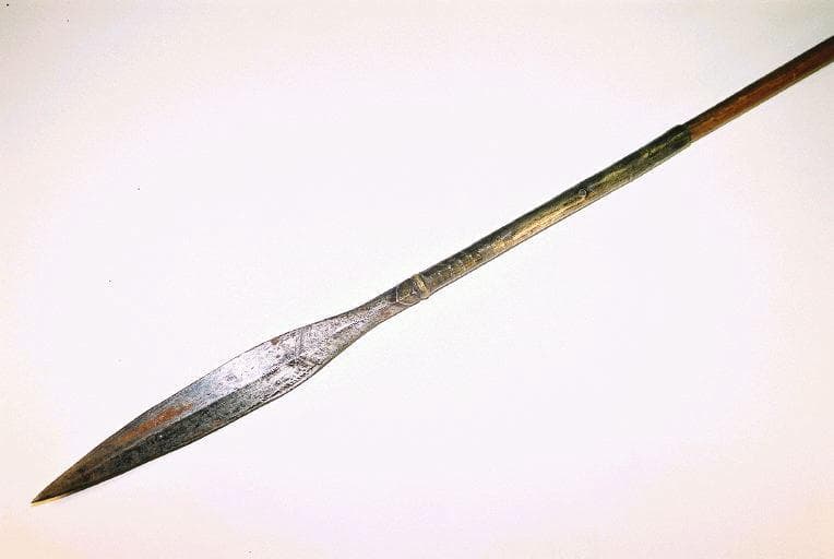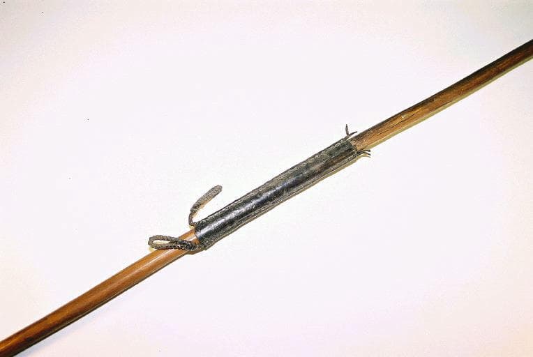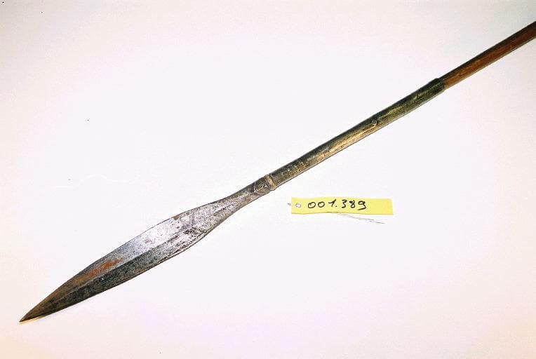 Sagaie dont le manche en bois est équipé dans sa partie médiane d'une gaine en cuir comportant deux boucles en cuir tressé servant de propulseur. Une extrémité du manche comporte un aileron en forme de spatule de fer. L'autre extrémité comporte une lame en fer formée d'une longue tige et d'une pointe en forme de feuile légèrement arrondie. La pointe et la tige sont décorées de motifs géométriques incisés. La tige comporte de rehauts de cuivre incrustés