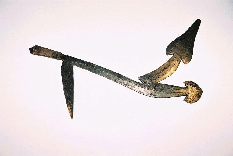 Couteau de jet dont la lame est formée de trois branches et la poignée est recouverte d'une bande de cuir cousue. La lame est décorée de motifs géométriques incisés