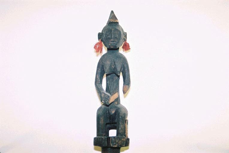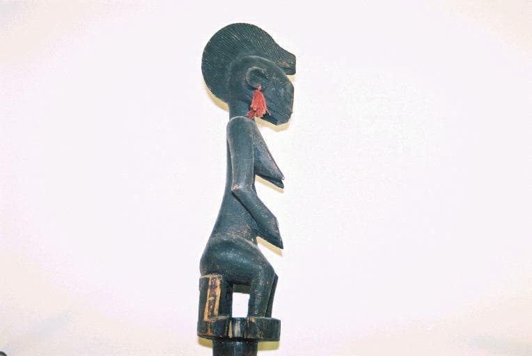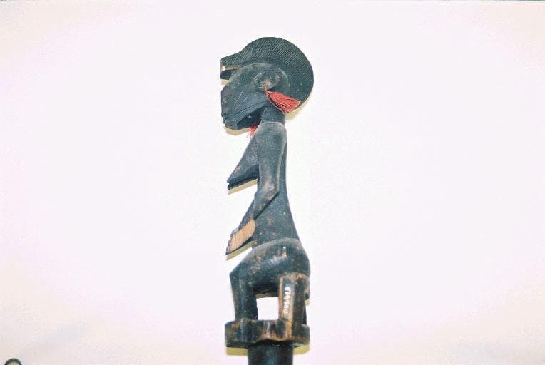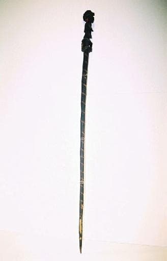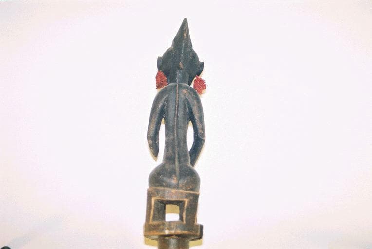 Bâton à section transversale circulaire surmonté d'un fétiche en ronde-bosse. Le bâton est parcouru sur toute sa longueur d'une bande claire enroulée en spirale et comporte 3 décors géométriques gravés dans le sens transversal. Le fétiche est un personnage féminin, nu, assis sur une sorte de trône. Coiffure en forme de crête. Les oreilles sont percées chacune d'un orifice dans lequel passe un élément en fils rouges