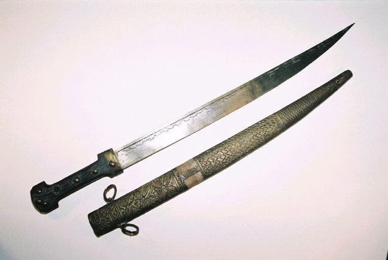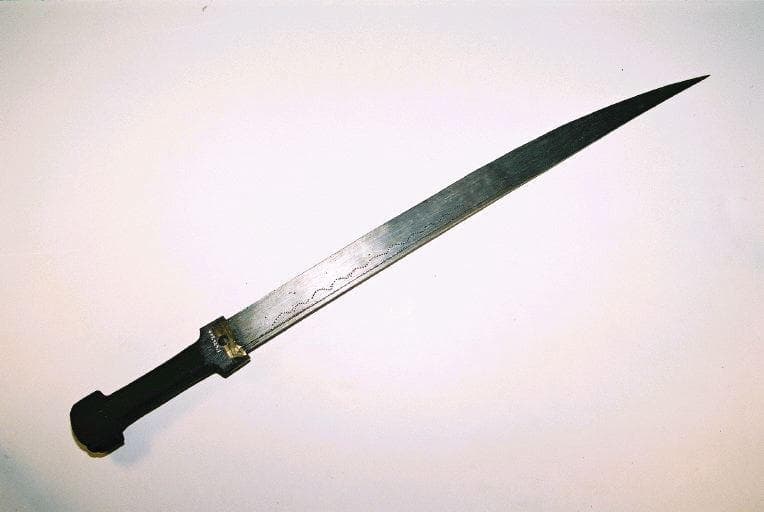 Sabre dont le manche en bois à section transversale rectangulaire comporte 12 clous en fer dont 9 possèdent une tête circulaire en cuivre. La partie du manche proche de la lame est sertie d'une bague en cuivre fixée par 2 clous en fer à tête de cuivre. La lame en fer à simple tranchant est décorée sur les deux faces d'un sillon gravé et de méandres composées de petits motifs triangulaires incisés. Equipé du fourreau 001.429.2
