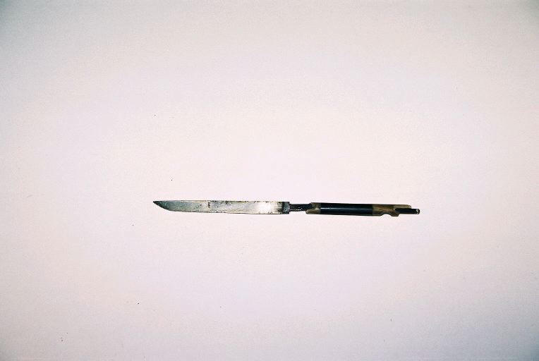 Couteau dont le manche en fer est recouvert de 2 zones de corne claire encadrant une zone de corne noire. La lame en fer est à simple tranchant