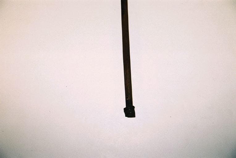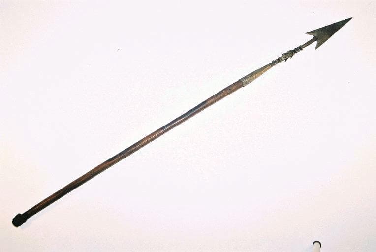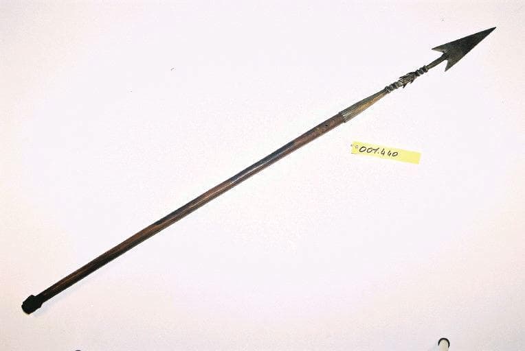 Lance dont le manche en bois est à section transversale circulaire. La manche est lesté à une extrémité par un anneau de fer. L'autre extrémité comporte une lame pointue précédée de barbelures saillantes