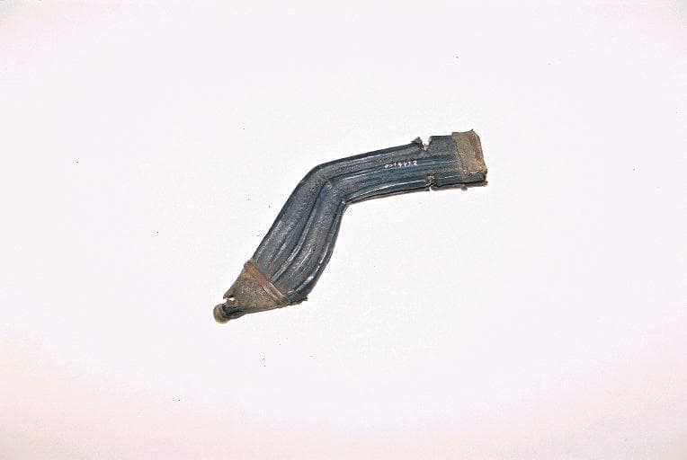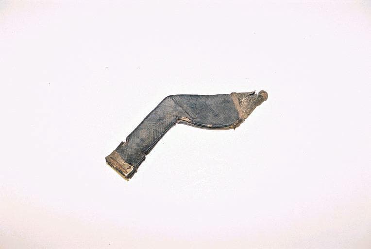 Fourreau du poignard 001.443.1 en carton recouvert de cuir décoré de motifs géométriques gravés. Les 2 extrémités du fourreau sont recouverts d'une peau de reptile cousue et maintenue par des lanières de cuir