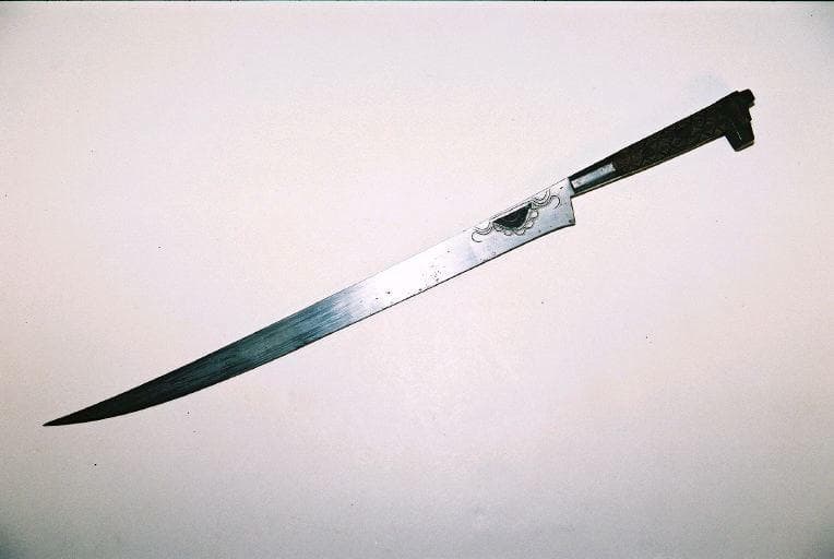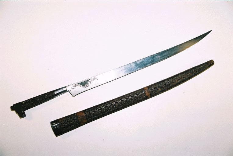 Poignard dont le manche en bois est à section transversale octogonale et est décoré de motifs géométriques gravés. Le pommeau est en forme de tête d'animal stylisé. La lame en fer à simple tranchant est décorée sur est décorée sur les deux faces de motifs géométriques et de rehauts cuivreux imitant un damasquinage. Equipé du fourreau 001.465.2