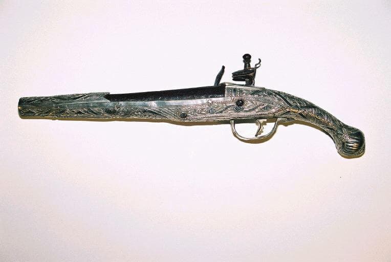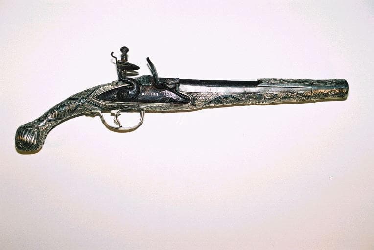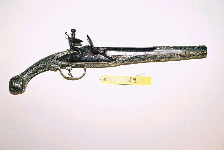 Pistolet à silex dont le chien et le canon sont en fer apparent. Les autres parties du pistolet sont recouvertes de plaques d'argent ciselées avec incrustations de plomb (?). La gâchette est en argent et est fixée par des vis à tête d'argent. La partie visible du canon en fer rouillé semble avoir été recouverte de cuivre (?)