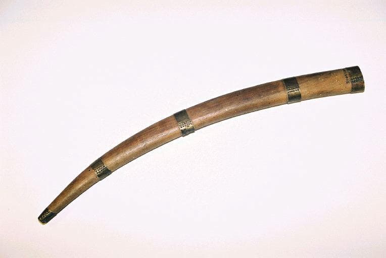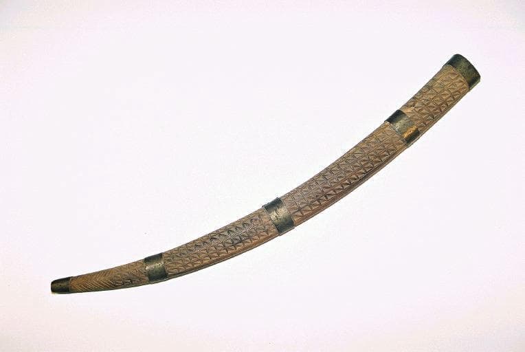 Fourreau du sabre 001.486.1 en bois comportant 5 bagues en cuivre et décoré de motifs géométriques gravés sur une face
