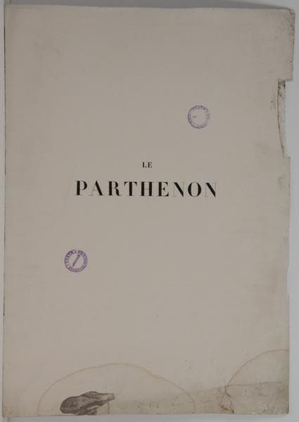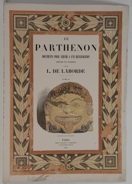 Couverture : LE PARTHENON DOCUMENT POUR SERVIR A UNE RESTAURATION REUNIS ET PUBLIE PAR L. DE LABORDE MEMBRE DE L'INSTITUT 1er. Livraison PARIS CHEZ LELEUX, LIBRAIRE 9, RUE PIERRE-SARRAZIN. 1848 Page 1 recto: LE PARTHENON Page 1 verso : PARIS. IMPRIME PAR PLON FRERES, RUE DE VAUGIRARD, 36. Page 2 recto : LE PARTHENON DOCUMENT POUR SERVIR A UNE RESTAURATION REUNIS ET PUBLIE PAR L. DE LABORDE TOME II Antéfixe peinte de l'ancien Hécatompédon. PARIS CHEZ LELEUX, LIBRAIRE 9, RUE PIERRE-SARRAZIN. 1848 Quatrième de couverture : MODE DE PUBLICATION. L'ouvrage complet formera deux volumes, l'un de 100 planches, l'autre de 100 feuilles de texte. Il sera publié en vingt livraisons de cinq feuilles de textes et de cinq planches. L'auteur, occupé à terminer la publication de son voyage en Orient, est obligé de retarder de deux ou trois mois l'impression du texte, qui paraîtra plus tard, en formant un ensemble dans les autres livraisons. LA LIVRAISON EST DU PRIX DE 20 FRANCS. Il paraîtra une livraison tous les mois. Six livraisons étant prêtes, on les enverra immédiatement à Messieurs les souscripteurs qui les réclameront ; elles contiennent, dans les 18 planches, tous les dessins faits par J. Carrey, à Athènes, en 1674, et 22 autres planches, dont la première livraison peut donner une idée sous le double rapport de l'intérêt scientifique et le l'exécution remarquable.