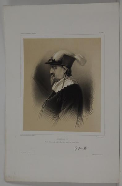 portrait (Christian IV de Danemark, roi du Danemark, homme, en buste, de profil, chapeau, plume, décoration) ; vue d'architecture (Danemark, Copenhague, architecture d'activité financière, place, personnage) ; paysage (Norvège, Lund, scierie, falaise, sapin, torrent, ouvrier, bûcheron, cabane) ; paysage (Norvège, montagne, glacier, baie, mer, bateau) ; représentation animalière (palmipède : guillemot)