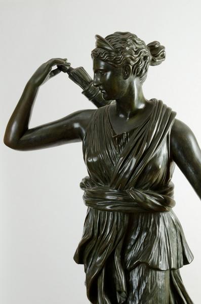 figure mythologique (Diane, debout, draperie, arc, flèche) ; représentation animalière (biche)