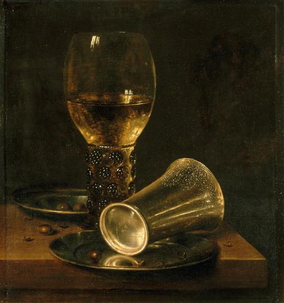 nature morte (table : bois, gobelet : argent : couché, assiette : étain, verre à pied, assiette : métal, noisette, écorce, effet de lumière, allégorie : orgueil)