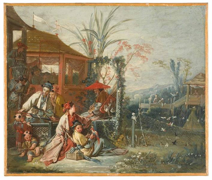 scène (Chinois, homme, femme, enfant, chapiteau, chasse : oiseau, cage, perroquet, filet) ; fond de paysage (montagne, jardin)
