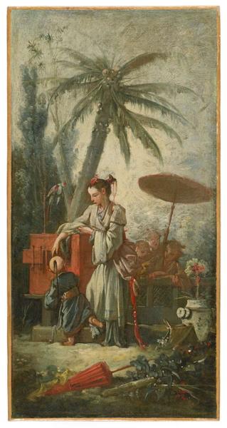 cette esquisse peinte fait partie d'une suite de peintures à sujet chinois commandée par Oudry(1686-1755), alors directeur de la manufacture de Beauvais, pour servir de cartons de tapisseries ; elle a été traduite en tapisserie à Beauvais.