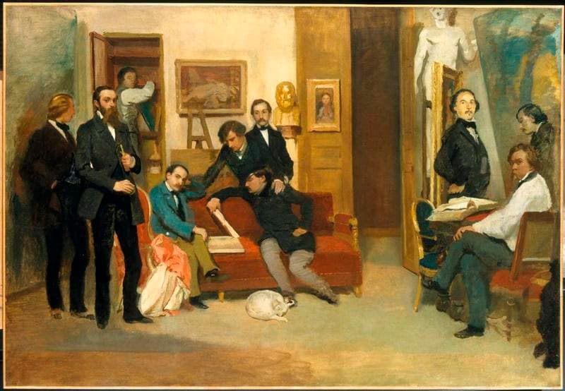 Cette vue de l'atelier du peintre, datée par son biographe Estignard de 1853 [...] exploite les conceptions réalistes de Gigoux mais [...] l'on perçoit des accents quasi impressionnistes que l'inachèvement du tableau accuse davantage [...]. Cette réunion d'artistes, encore dans la tradition des intérieurs d'ateliers chers aux peintres de la première moitié du siècle, annonce les vues similaires des impressionnistes. (in PINETTE Matthieu et SOULIER-FRANCOIS Françoise, De Bellini à Bonnard, Paris, Pierre Zech Editeur, 1992, p.176)