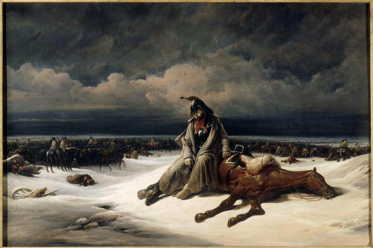 Exposé au salon de 1838 (n°1657), le tableau représente un épisode de la retraite qui suivit la désastreuse campagne de Napoléon en Russie (1812).[...] La toile est à replacer au sein du cycle qui, de Gros à Meissonier (1815-1891), va, tout au long du XIXe siècle illustrer l'épopée napoléonienne. [...] Davantage qu'une critique d'ordre politique, ces images sont aussi des manifestes de l'élan romantique, car au-delà d'un fait historique donné, c'est surtout la condition de l'homme qui est évoquée dans ces implacables peintures de la déchéance et de la désillusion, où l'on nous présente des soldats [...] confrontés à une fin imminente, solitaire, lamentable et humiliante. (in PINETTE Matthieu et SOULIER-FRANCOIS Françoise, De Bellini à Bonnard, Paris, Pierre Zech Editeur, 1992, p.170)