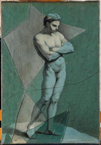 La toile figure un trompe-l'oeil au verre cassé, avec une gravure (?) d'Edme Bouchardon (1698-1762) reproduisant une académie d'homme.