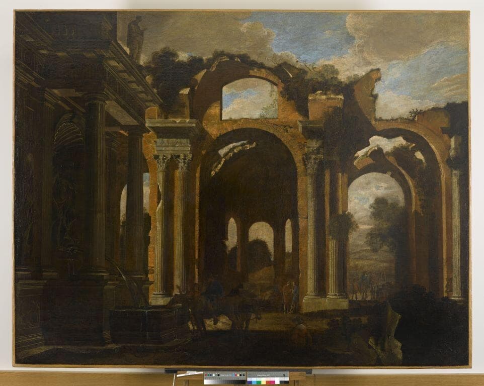 La date de 1641, que l’on peut remarquer sur un morceau d’architecture brisée, à côté du monogramme WC de Codazzi, est un point de repère précieux dans la carrière de l’artiste. Ce dernier, alors au milieu de son séjour à Naples, restera encore six années dans cette cité, avant de retourner à Rome. [...] L'architecture semble plus ”diluée” dans l'atmosphère, elle-même plus chaude : nuages grisonnants et roses tiédissant le ciel azur, briques dans des tonalités de rose-orangé et colonnes dans les gris-beige. ”Chez Codazzi, l'architecture est vue dans la vérité particulière de l'air, de l'heure, de l'ombre et de la lumière” (Roberto Longhi, ”Codazzi e l'Antologia”, dans Paragone, n°123, 1960, p.43). [...] Ce tableau est inspiré de la Basilique de Maxence à Rome et peut-être d'une des gravures de Serlio pour le ”Templum Pacis”. Ce monument inspirera différentes toiles à Codazzi : l'une, avec des figures peintes par François Perrier est conservée dans une collection particulière romaine (Maurizio Marini, ”Viviano Codazzi, il capriccio del vero”, dans Ricerche di storia dell'arte, 3, 1976, p.121-136) ; l'autre, sans figures et s'attachant à la partie centrale du temple, à la Galerie Spada à Rome (Federico Zeri, La galleria Spada in Roma, Rome, 1954, p.63, n°346, fig.56). (in BREJON de LAVERGNÉE Arnauld (sous la dir. de), “Peintures napolitaines du Musée des Beaux-Arts et d’Archéologie de Besançon”, 1986, p.17, notice par Valérie LAVERGNE et Arnauld BREJON de LAVERGNÉE)