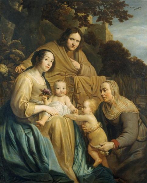 scène biblique (Sainte Famille, Enfant Jésus, Vierge, Joseph, sainte Elisabeth de Jérusalem, saint Jean-Baptiste : enfant) ; fond de paysage (fleur, arbre, feuillu, rocher, forêt)