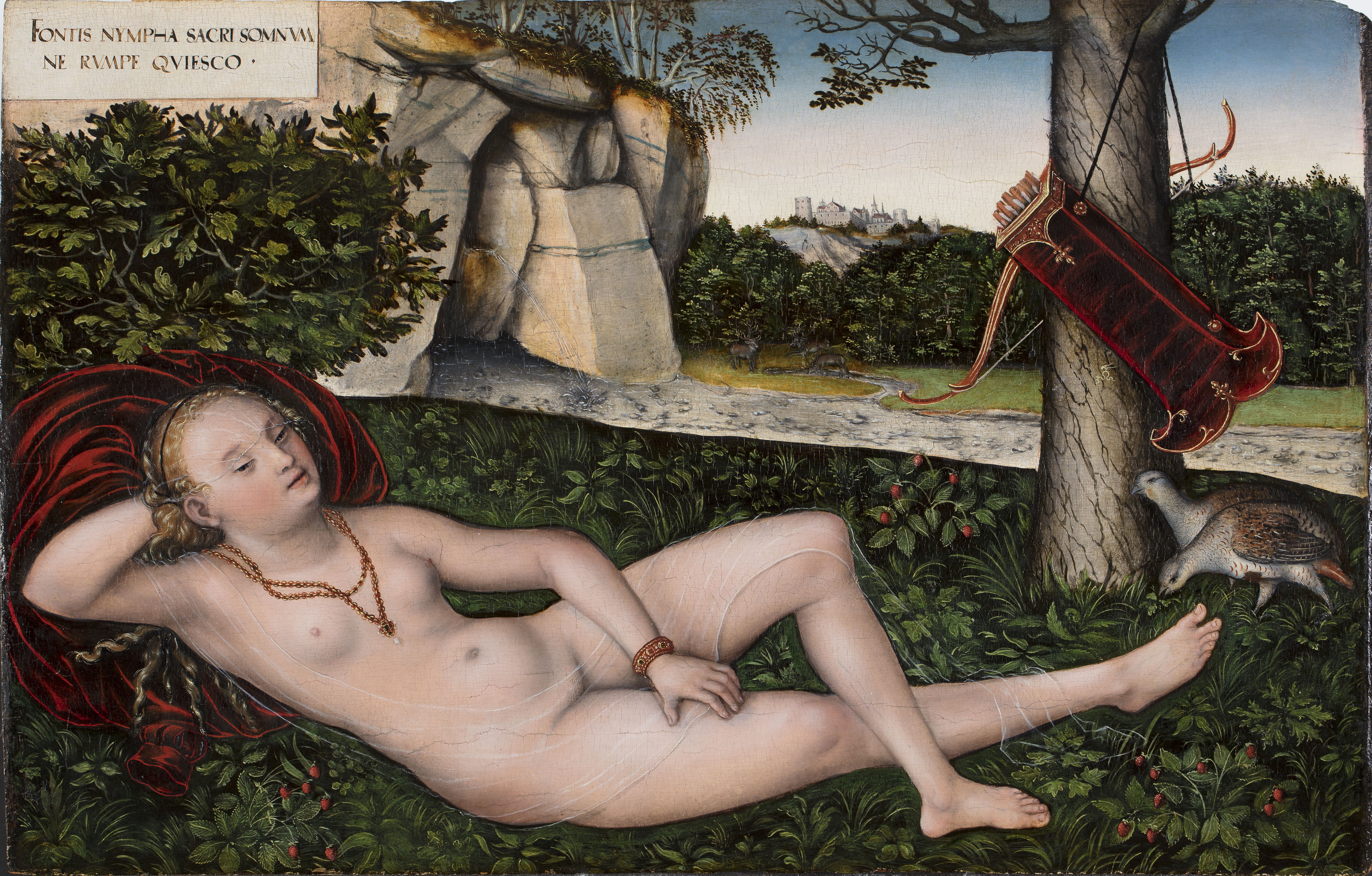 Longtemps intitulé Le Repos de Diane [...]. Le cartel éclaire le sens qu'il convient de lui donner [...]. Il s'agit donc explicitement de la représentation d'une nymphe protectrice d'une source. Si l'assimilation du sujet à Diane ne s'impose pas, on peut cependant, [...], imaginer une certaine parenté entre la fille de Zeus et la nymphe, car les attributs de celle-ci [...] sont aussi ceux de la déesse chasseresse [...] L'artiste cultive à dessein l'ambiguïté de la situation en présentant cette figure voluptueusement étendue, [...], offerte et rebelle à la fois, dans une nature précisément ourlée aux colories acides. Il met en place avec brio une situation équivoque bien conforme aux goûts du temps dans les pays germaniques. (in PINETTE Matthieu et SOULIER-FRANCOIS Françoise, De Bellini à Bonnard, Paris, Pierre Zech Editeur, 1992, p.44) ;