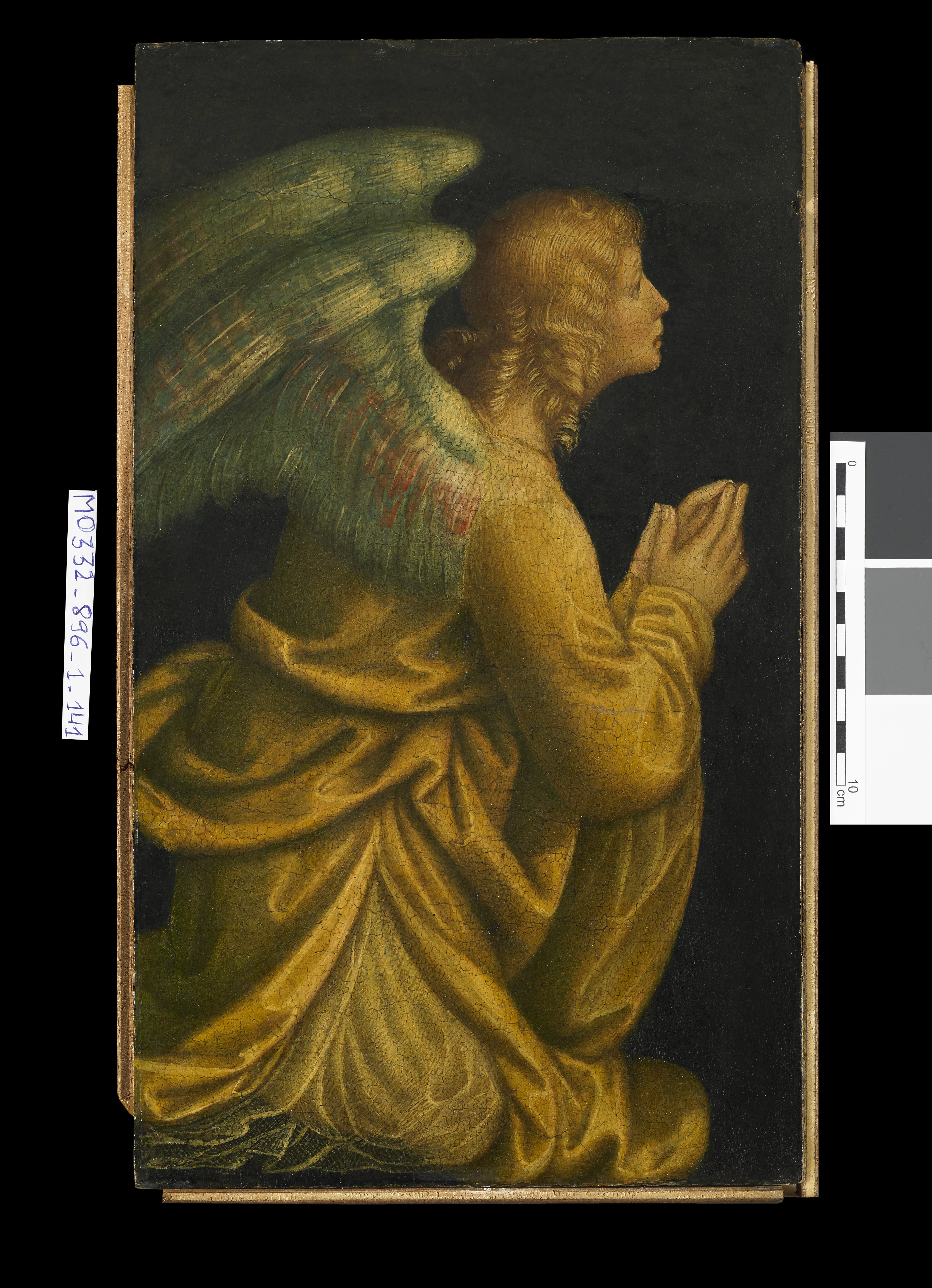 Ce petit panneau, ainsi qu’un autre représentant un ange adorateur et conservé également au musée de Besançon, devaient entrer autrefois dans la composition d’un retable, mais il n’est pas possible aujourd’hui d’indiquer dans quel ensemble ils s’inscrivaient. Ces deux anges agenouillés [...] devaient en effet se faire face symétriquement de part et d’autre d’un élément central aujourd’hui disparu. Le style de ces tableaux appartient bien à Gaudenzio [...] on connaît d’autres oeuvres de petit format où [...] tout s’accorde avec les panneaux bisontins. in PINETTE Matthieu et SOULIER-FRANCOIS Françoise, De Bellini à Bonnard, Paris, Pierre Zech Editeur, 1992, p.48