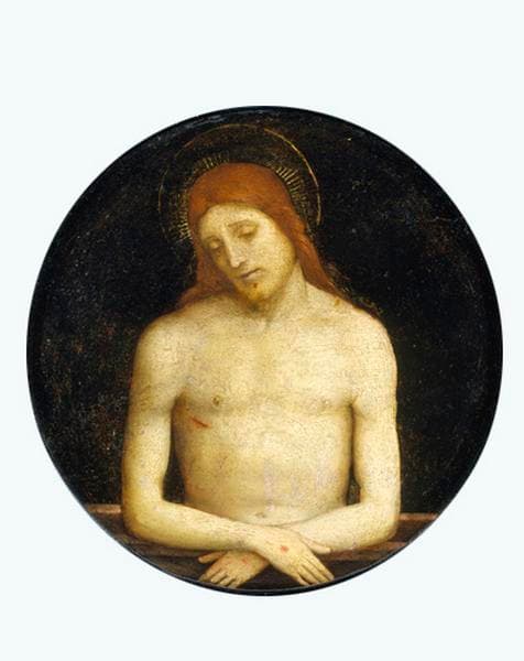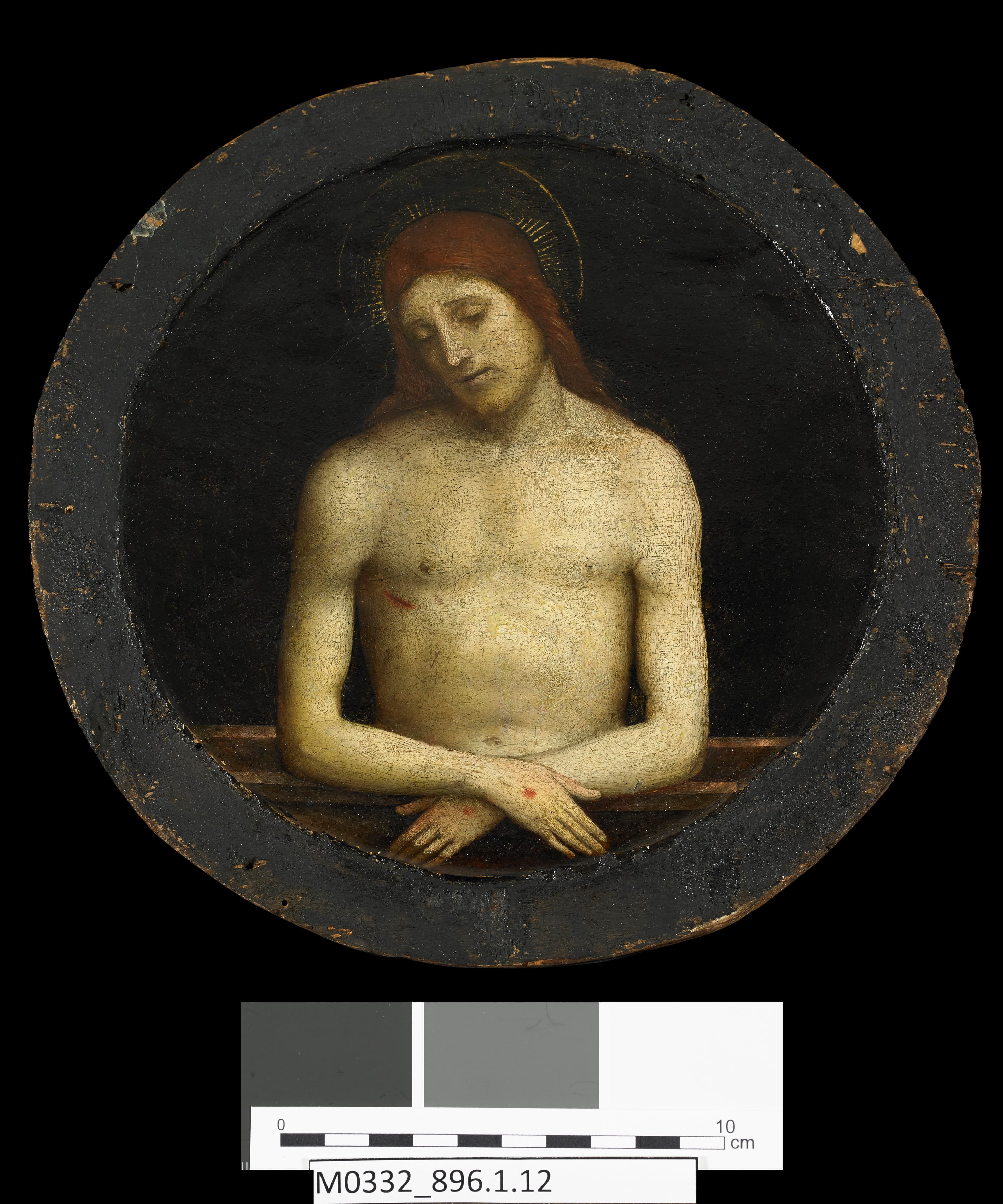 Le sujet du tableau est bien le Christ mort, tel qu’il apparaît miraculeusement lors de la messe de saint Grégoire par exemple, et non la représentation d’un Ecce Homo comme on l’a souvent avancé [...]. Ce petit tondo prenait certainement place à l’origine au centre de la prédelle d’un retable [...]. Autrefois attribué à Giovanni Bellini le tableau revient évidemment à Francia et l’on y retrouve toutes les caractéristiques formelles et chromatiques du peintre bolonais. in PINETTE Matthieu et SOULIER-FRANCOIS Françoise, De Bellini à Bonnard, Paris, Pierre Zech Editeur, 1992, p.28