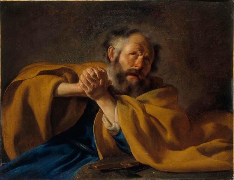 ' Ce tableau représente saint Pierre repentant, identifiable grâce aux clés placées devant lui. Il est figuré à mi-corps, les mains pressées l'une contre l'autre et levées en signe de prière. Le sujet, l'attitude dramatique du personnage, la palette où dominent les bruns, la lumière intense qui creuse des ombres profondes appartiennent au style caravagesque [...]. Cette toile a été attribuée à un artiste actif à Utrecht, Johannes Moreelse, souvent qualifié d'imitateur de Ter Brugghen, appellation qui pourrait se justifier car l'influence de ce peintre a été forte sur sa production [...] Son oeuvre connu n'est constitué que de sept tableaux signés ou monogrammés, dont les deux figures d'Héraclite et Démocrite d'Utrecht. La comparaison entre le Saint Pierre repentant et les personnages d'Utrecht est si éloquente qu'elle permet d'attribuer avec certitude le tableau bisontin à cet artiste peu représenté dans les musées français. ' in LAVALLEE Marie-Hélène, Peintures flamandes et hollandaises des XVIIe et XVIIIe siècles, Paris, Edition de la Réunion des musées nationaux, 1998, p.136