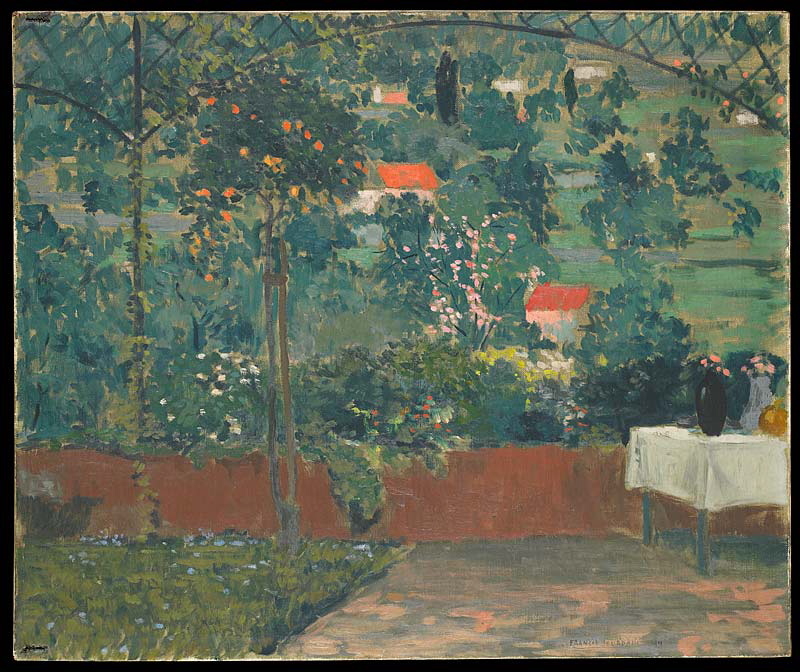 paysage (jardin, arbuste, haie, table : nappe : blanc, vase, village, arbre)