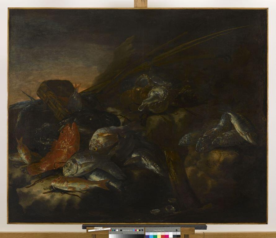 Il semble permis de voir dans cette toile de format analogue, un pendant de ”Poissons de mer et crabes” [également conservé au musée de Besançon, inv.843.3.2] : composition, style et exécution sont en tous points comparables. Pendants ou seulement simple variation sur le même thème exécuté à la même époque, on remarquera comment les deux compositions se répondent l’une à l’autre, comment le très beau motif ici des coquillages appelle l’ouverture centrale de la toile précédente [inv.843.3.2]. [...] Cette œuvre forme, au musée des Beaux-Arts de Besançon, avec la précédente également signée du rare monogramme, un ensemble tout à fait exceptionnel qui n’a peut-être pas reçu, de même que la toile de Giovanni Battista Recco, toute l’attention qu’il mérite. (in BREJON de LAVERGNÉE Arnauld (sous la dir. de), “Peintures napolitaines du Musée des Beaux-Arts et d’Archéologie de Besançon”, 1986, p.27, notice par Alain BIGEARD)