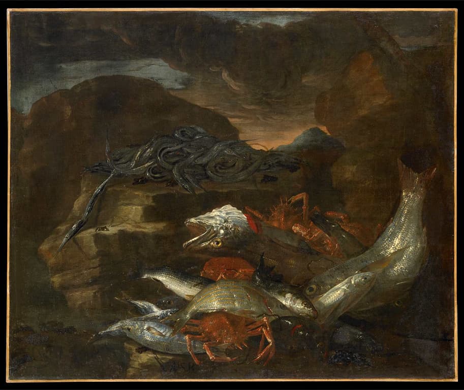 Monogrammée E.Q.S.R. (Eques Recco, c’est-à-dire “le chevalier Recco”), cette toile se rattache à un groupe d’œuvres que l’on s’accorde aujourd’hui à situer à la fin de la carrière de l’artiste ; une Nature morte qui porte le même monogramme suivi de la date 1691 étaye cette hypothèse. Il convient de remarquer cependant que l’on ignore toujours l’origine de ce titre que l’artiste place en évidence en tête de son nom et qui remplace l’habituelle signature Ge Recco ou Gios Recco (Delogu 1964 p.27-28). [...] La toile est exemplaire de l’art de Giuseppe Recco et de son sens remarquable de la composition. Aux schémas architecturés, aux rythmes amples et mesurés, Giuseppe oppose, dans les toiles de la maturité, un art plus subtil de la composition [...]. Cette recherche de l’animation, voir de l’effet dramatique – très beau motif de la tête de poisson au centre – semble marquer une progression dans les dernières œuvres de l’artiste vers des compositions plus complexes et plus fougueuses, presque pathétiques [...]. On notera cependant ici de Giuseppe une technique plus rapide et expéditive, une pâte plus épaisse et plus grasse, des glacis plus vibrants, une variété de la touche et des rehauts posés plus largement, de grands aplats de couleurs et des tons rompus particuliers : un orangé et un brun doré qui ravivent le tonalisme argenté de son aîné. (in BREJON de LAVERGNÉE Arnauld (sous la dir. de), “Peintures napolitaines du Musée des Beaux-Arts et d’Archéologie de Besançon”, 1986, p.26, notice par Alain BIGEARD)