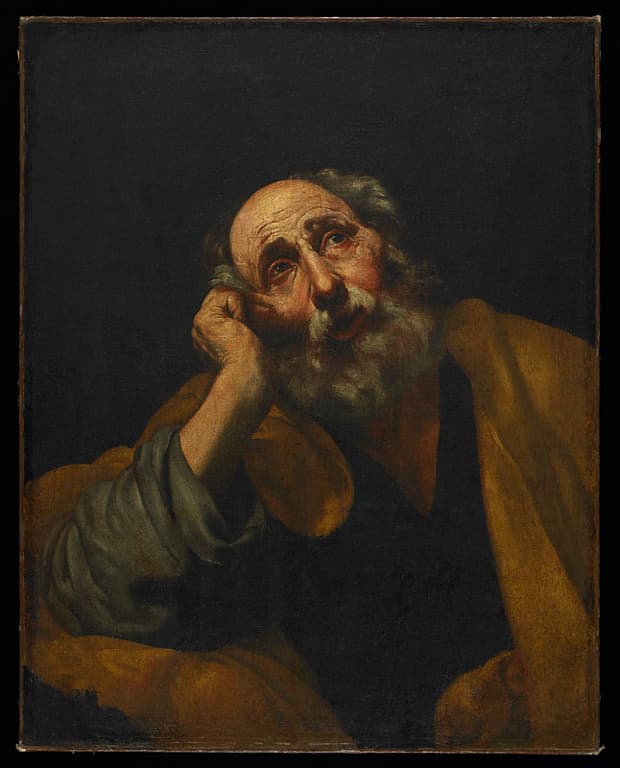 Il s’agit d’une copie d’après un original perdu de Ribera, lui-même connu par deux copies où le saint est représenté de trois-quarts (Rouen, musée des Beaux-Arts, et Munich, Alte Pinacothek; Spinosa, op. cit., n°339 et 340, p.134-135). [...] le saint est vu à mi-corps et affleure plus la surface picturale que dans les deux autres copies citées plus haut. La composition a été reprise un grand nombre de fois par Ribera, qui y a apporté à chaque fois quelques variantes ; dans le cas précis de ces Saint Pierre, il est souvent difficile de faire la part exacte du maître espagnol et de ses suiveurs. Quoi qu’il en soit, Ribera a été tenté un grand nombre de fois par le thème du premier compagnon du Christ, qu’il a représenté soit en larmes, soit en train de méditer ou alors pénitent. Il nous semble important d’insister en conclusion, sur les rapports de ce Saint Pierre avec Guido Reni. Aspect de la mise en page, souci de réalisme tempéré par un goût de rhétorique, insistance sur le pathétique, autant de critères qui permettent de rapprocher les deux artistes, de style pourtant si différent ; déjà jeune, Ribera avait été influencé par le maître bolonais (Calvaire, d’Osuna) et cette influence a joué tout au long de sa carrière napolitaine. [...] (in BREJON de LAVERGNÉE Arnauld (sous la dir. de), “Peintures napolitaines du Musée des Beaux-Arts et d’Archéologie de Besançon”, 1986, p.38, notice par A. Brejon de Lavergnée)