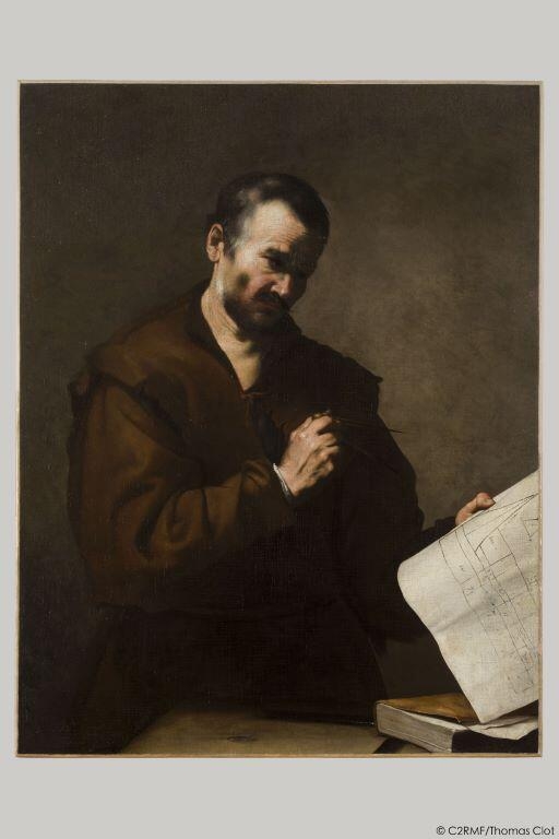 Les historiens de l’art émettent des avis différents quant à la paternité du prototype, en l’occurrence pour cet architecte, le ” Philosophe” de la collection Kress déposé à Tucson. [..] Il semble probable qu’à l’origine la toile de Tucson ait fait partie d’une série de «portraits» de sages et de philosophes de l’Antiquité (Platon, Amiens ; Archimède, Madrid ; Philosophe, Kingston-Upon-Hull...), sorte de contrepoint à la série sacrée des «Portraits» d’apôtres conservés aujourd’hui au Prado. Pour Fitz Darby, le tableau de Tucson représente Héraclite. On a émis l’hypothèse qu’une telle série de ” philosophes” a pu être peinte pour le néohumaniste duc d’Alcalà, vice-roi de Naples de 1629 à 1631. De l’original de Tuscon, on connaît plusieurs répliques ou plutôt des copies (anc. coll. Matarazzo; palais Ferretti à Ancône et celle de Besançon). [...] (in BREJON de LAVERGNÉE Arnauld (sous la dir. de), “Peintures napolitaines du Musée des Beaux-Arts et d’Archéologie de Besançon”, 1986, p.36 , notice par Isabelle AUFFRET et A. BREJON de LAVERGNÉE)