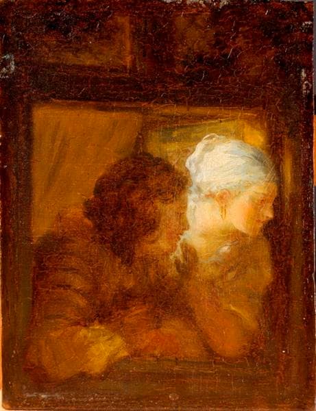 Les sujets [Jeune couple à la fenêtre et Jeune femme et enfant] n'ont rien de surprenant chez Fragonard : la douceur de la tendresse maternelle, comme la passion familière des jeunes amants, sont des motifs qui abondent tout au long de sa carrière. [...] Nos deux peintures suscitent la question de savoir s'il s'agit de deux détails d'une même scène, deux amants familièrement accoudés [...] contemplant une femme jouant avec son bébé, ou de deux épisodes successifs de la vie d'une heureuse famille : le couple jeune et le premier fruit de leur union. (in PINETTE Matthieu et SOULIER-FRANCOIS Françoise, De Bellini à Bonnard, Paris, Pierre Zech Editeur, 1992, p.136)