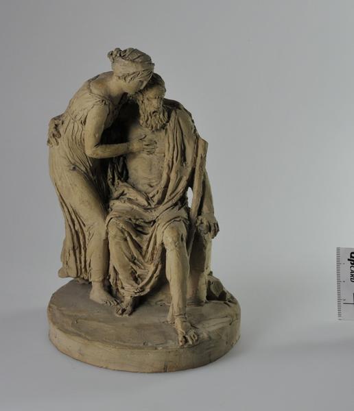 OUdipe, vieillard aveugle, assis, enlace la taille de sa fille qui se tient debout penchée vers lui; la main droite de la jeune fille repose sur la poitrine du vieil homme